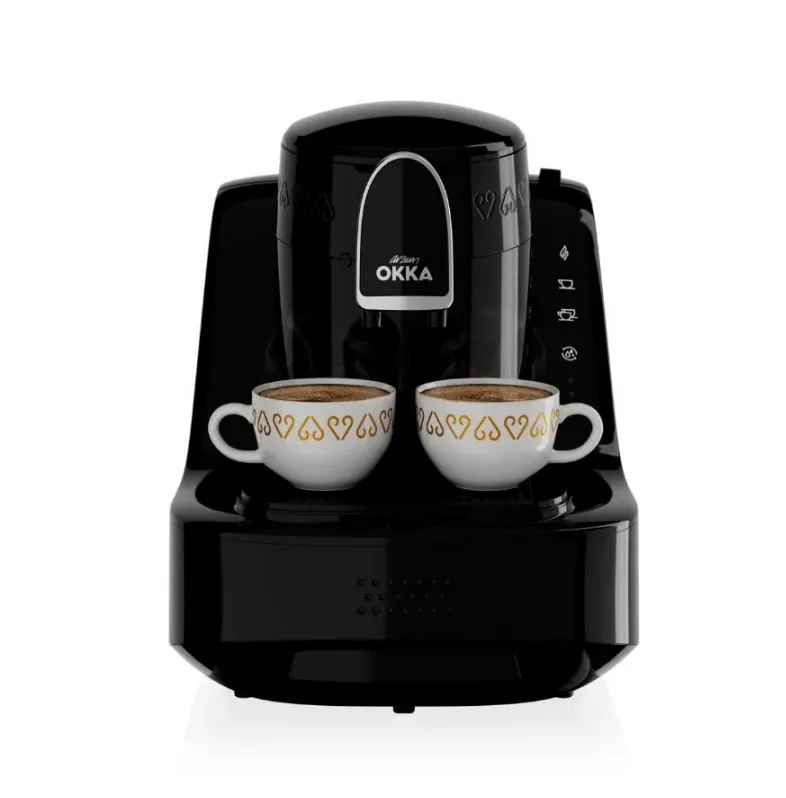 ماكينة OKKA Elite OK0040-20 باللون الأسود/فضي بقدرة حوالي 710 واط، مزودة بلوحة تحكم تعمل باللمس وتكنولوجيا تخمير متعددة لتجربة قهوة تركية فاخرة بلمسة زر واحدة.