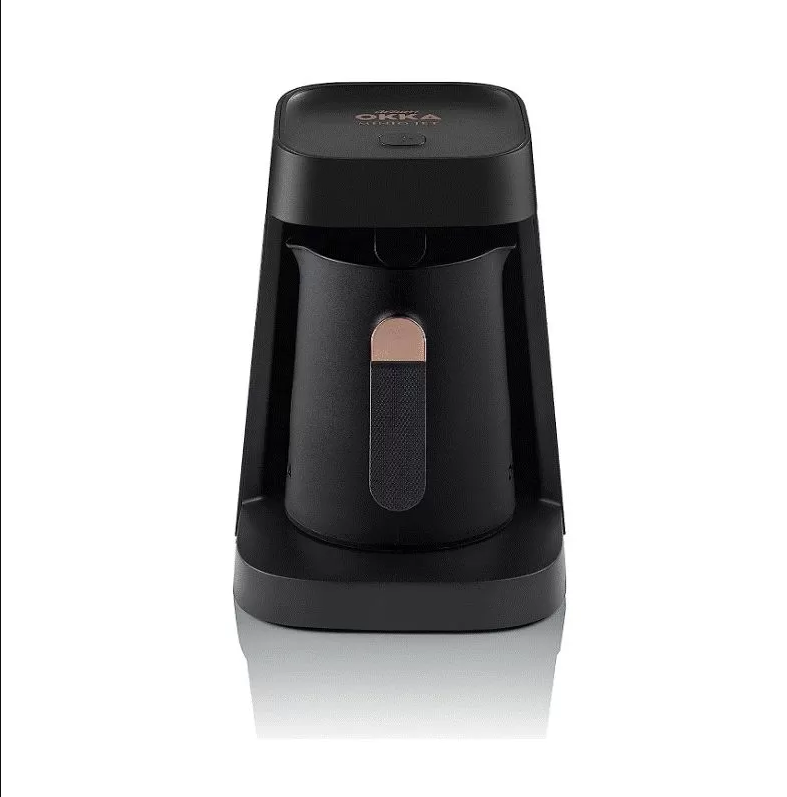 ماكينة OKKA Minio Jet OK0017 باللون الأسود/فضي (Black/Chrome) بقدرة 400 واط تقريبًا، تُحضّر من 1 إلى 5 فناجين قهوة تركية بضغطة زر واحدة مع نظام ذكي لمنع الفيضان.