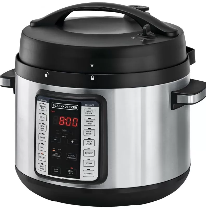 خلاط / جهاز طهي بلاك أند ديكر PCP1010‑B5 — طباخ ضغط/بخاري 9‑في‑1: سعة 10 لتر، قدرة 1350 واط، تصميم أسود / فضي.
