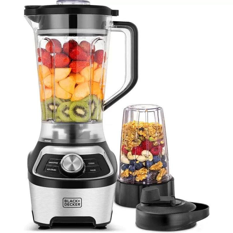 خلاط بلاك أند ديكر موديل BXH1200 بقدرة 1200 وات وسعة 1.85 لتر، مع تصميم ستانلس ستيل وكوب سفر لتحضير العصائر والسلسات بسهولة وسرعة.