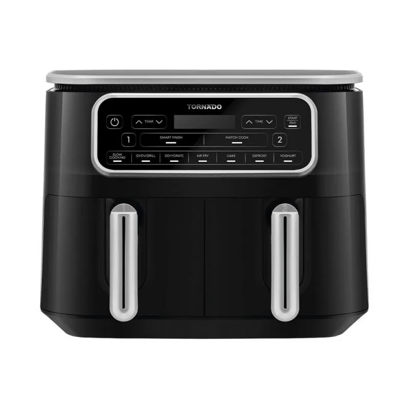 قلاية هوائية من Tornado موديل THF-2508DU-BS ذات سعة 8 لتر (مقسّمة إلى درجَين × 4 لتر لكل منهما)، بقدرة كهربائية 2500 واط، تحكّم رقمي ديجيتال، وتُقدِّم طهيًا مزدوجًا مستقلًا — مثالية لعائلة كبيرة أو لإعداد طبقَين في وقت واحد.