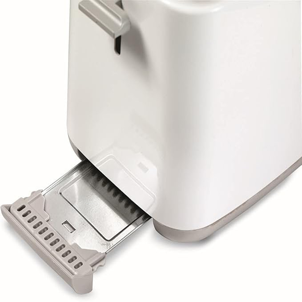محمصة خبز من كينوود بسعة شريحتين، بقدرة حوالي 640‑760 واط، مع تصميم أنيق ولون أبيض، وتضم خصائص مثل التحكم في درجة التحميص، وظيفة فك التجميد، صينية قابلة للإزالة لجمع فتات الخبز، وملمس خارجي بارد.