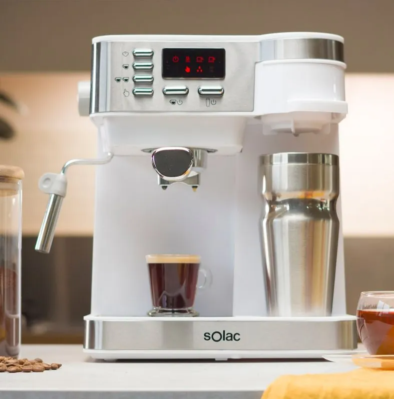 جهاز Solac Multi Stillo CE4497 هو ماكينة قهوة متعددة الاستخدامات تجمع بين إعداد القهوة الإسبريسو، القهوة بالتقطير، والكابتشينو، بضغط مضخة يصل إلى 20 بار تقريبًا، وتأتي مع ترمس ومحضر أبخرات لتوفير رغوة الحليب.