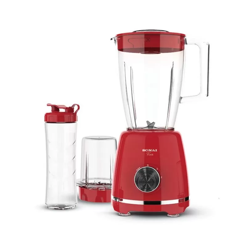 الوصف في جملة واحدة: خلاط سوناي فلير SH-6060 بقدرة 500 وات وسعة 1.5 لتر باللون الأحمر، يأتي مع مطحنة وكوب إضافي لتلبية احتياجاتك المتنوعة.