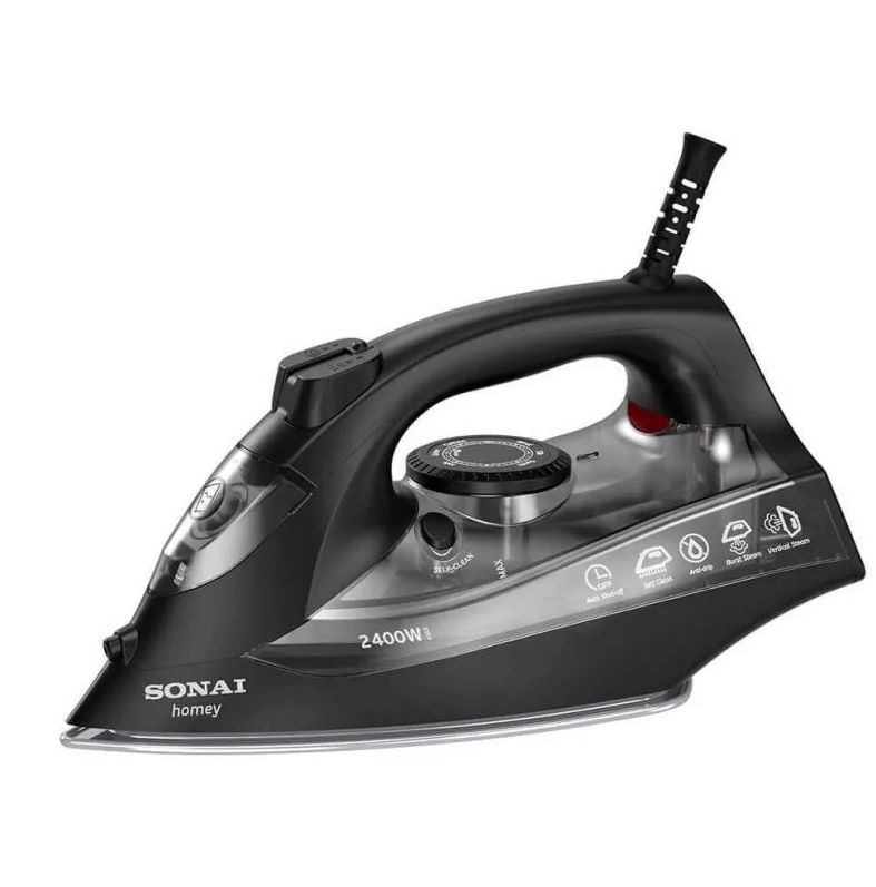 ماكينة كيّ بالبخار Sonai MAR‑8400 بقدرة 2400 واط ، مزوّدة بقاعدة سيراميك غير لاصقة، مع وظائف بخار متنوعة مثل الضباب (spray mist) والتحكّم بالبخار، لتجربة كيّ فعّالة في المنزل.
