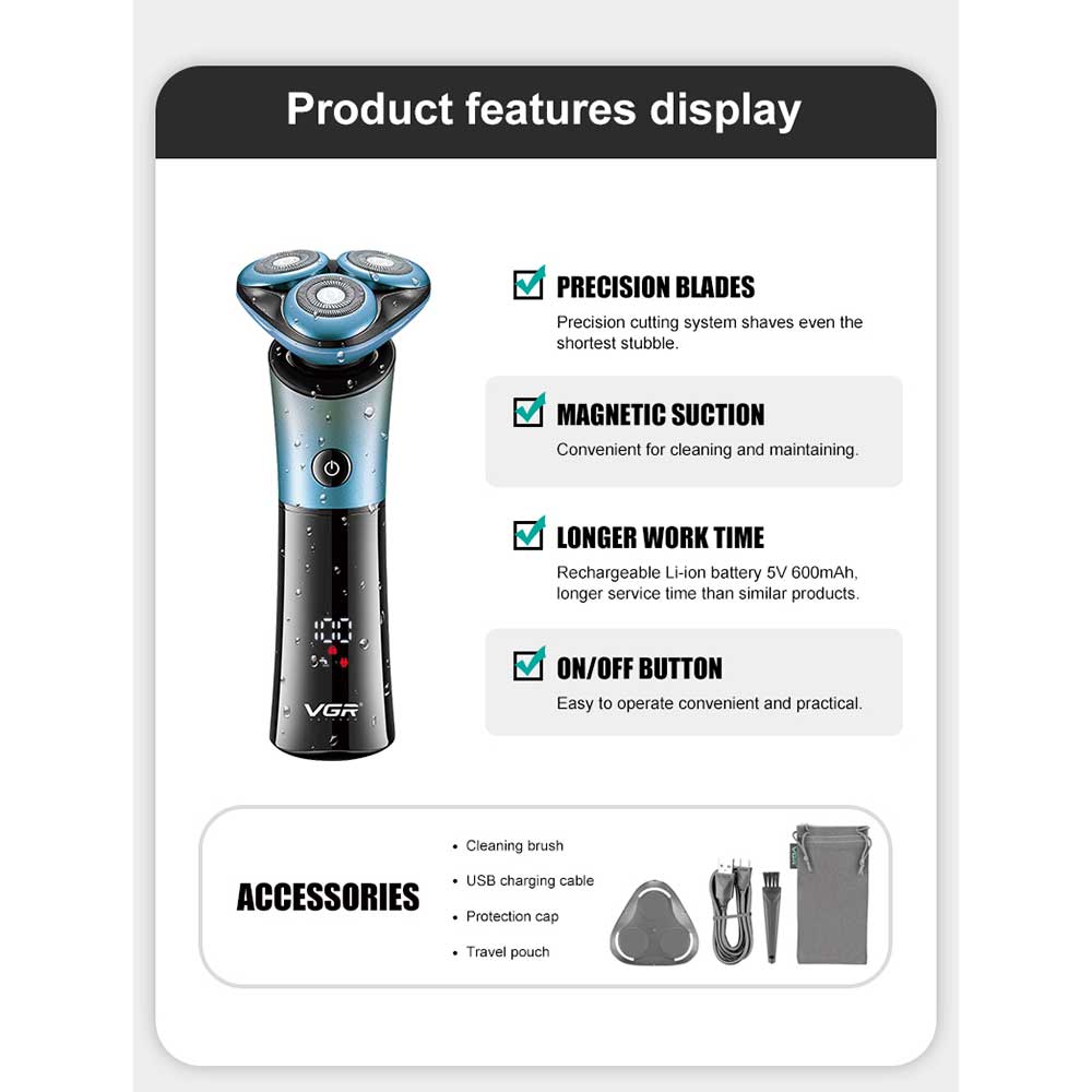 ماكينة حلاقة من في جي ار هي ماكينة حلاقة احترافية للعناية الشخصية مصممة لتوفير حلاقة ناعمة ولطيفة. تتميز ماكينة الحلاقة برأس حلاقة قابل للتعديل بخمس اتجاهات يوفر تحكمًا دقيقًا في شكل وطول الشعر. كما أن لديها شفرة فولاذية مقاومة للصدأ توفر نتائج حلاقة دقيقة.