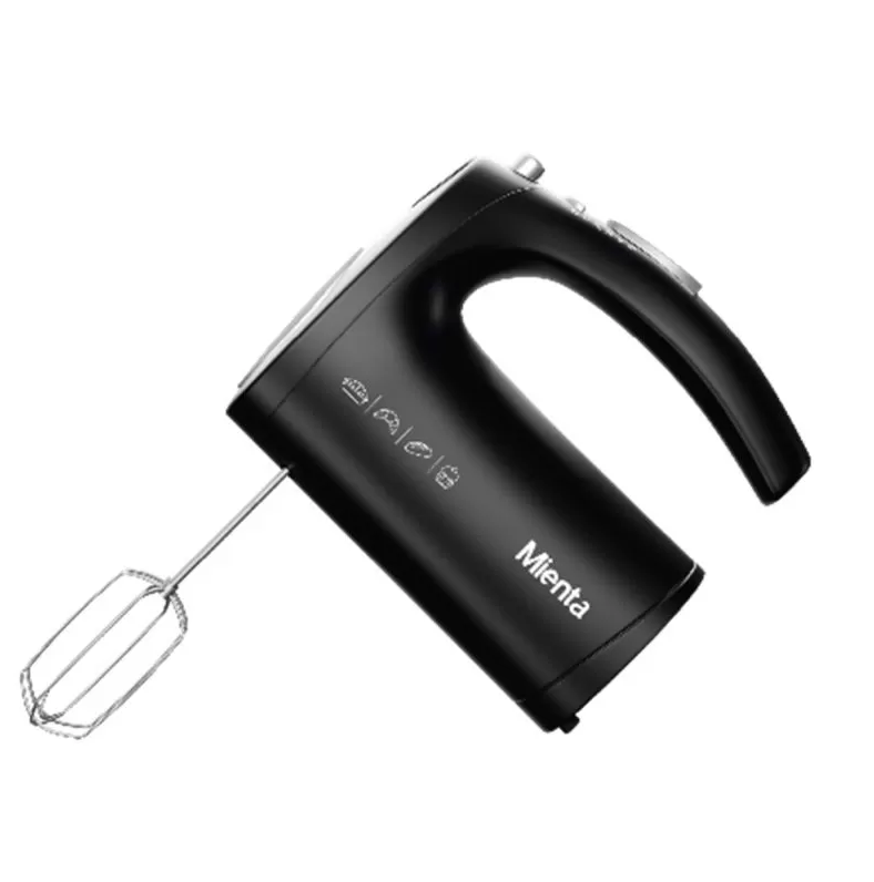 مضرب بيض Mienta بقوة 500 وات، يأتي بلون أسود أنيق، مزوّد بخمسة مستويات سرعة بالإضافة إلى وظيفة “TURBO” لنتائج أسرع وأكثر كفاءة – مثالي لتحضير الكيك والحلويات بسهولة.