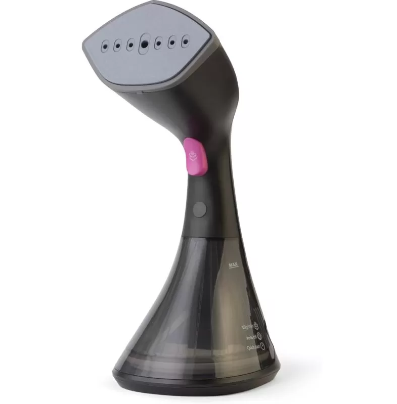 ماكينة مكواة بخار متنقلة MediaTech MT‑GS105 بقدرة 1630 واط، مزوَّدة بقاعدة سيراميك، خزان ماء ~200 مل، وتتيح استخدامًا رأسيًا/أفقيًا — مثالية للكي السريع سواء في المنزل أو أثناء السفر.