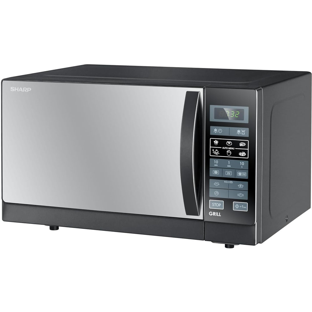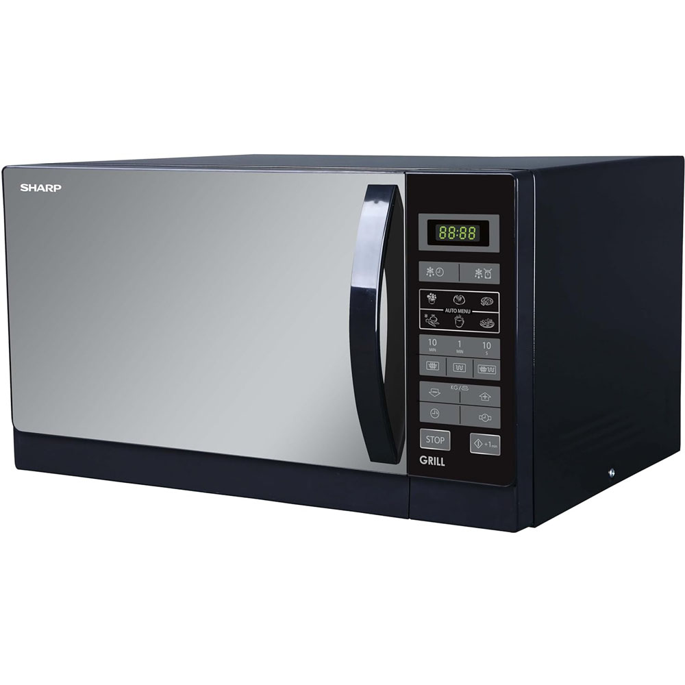 مايكروويف عملي بسعة 25 لتر، قدرة 900 وات مع شواية 1000 وات، 6 قوائم طبخ تلقائي، 5 مستويات للطاقة، قفل أمان للأطفال وتصميم أنيق باللون الأسود.
