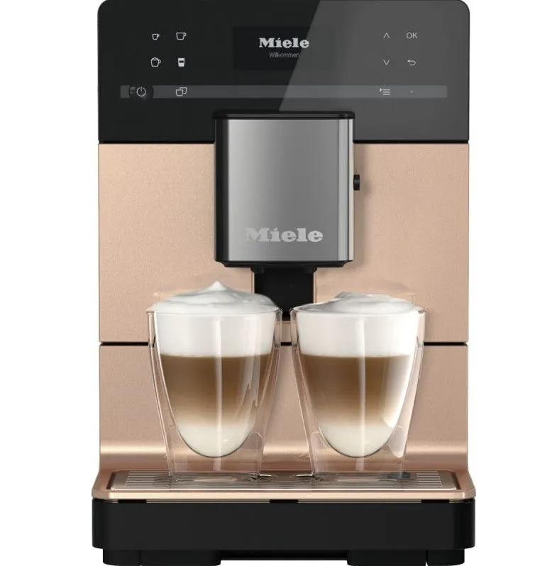 جهاز Miele CM 5510 ماكينة قهوة أوتوماتيكية بالكامل «Bean‑to‑Cup» بلمسات رقمية وتصميم ذهبي أنيق، يتيح إعداد مشروبات القهوة بنقرة زر (إسبريسو، كابتشينو، لاتيه، إلخ).