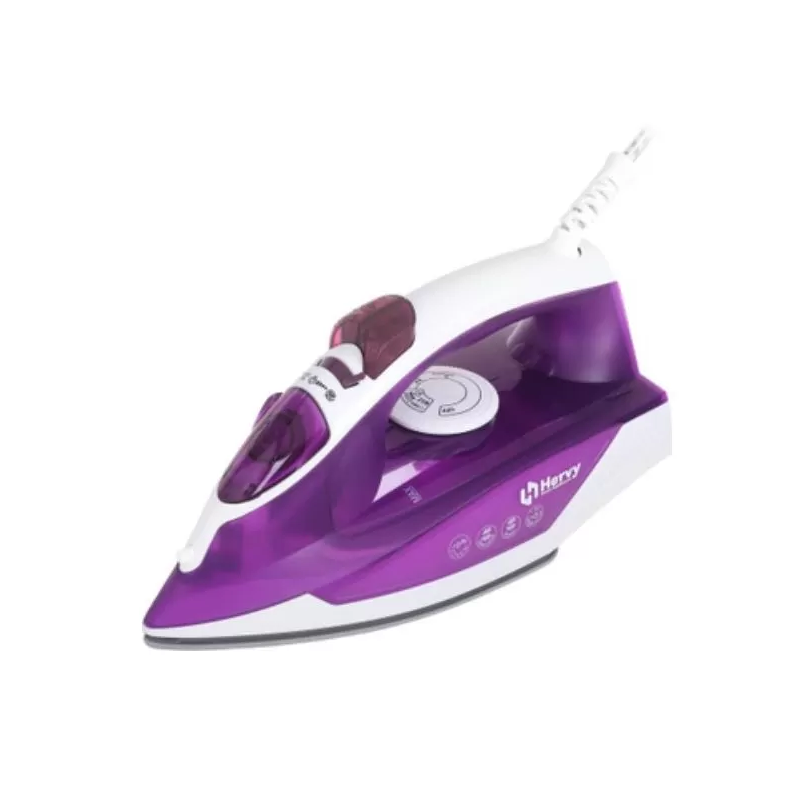 مكواة هيرفي فيردي H‑10026 بقوة 2200 واط، قاعدة سيراميك، بخار متعدد المستويات، تصميم أنيق باللون الموف‑أحمر لتجربة كي فعّالة وآمنة.