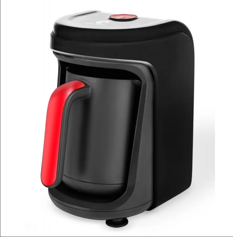 ماكينة قهوة تركي أوتوماتيكية White Whale WCM‑761 WG بقدرة 1000 واط تقريبًا، تصلح لتحضير حتى 5 فناجين دفعة واحدة، بتصميم أسود/أحمر.