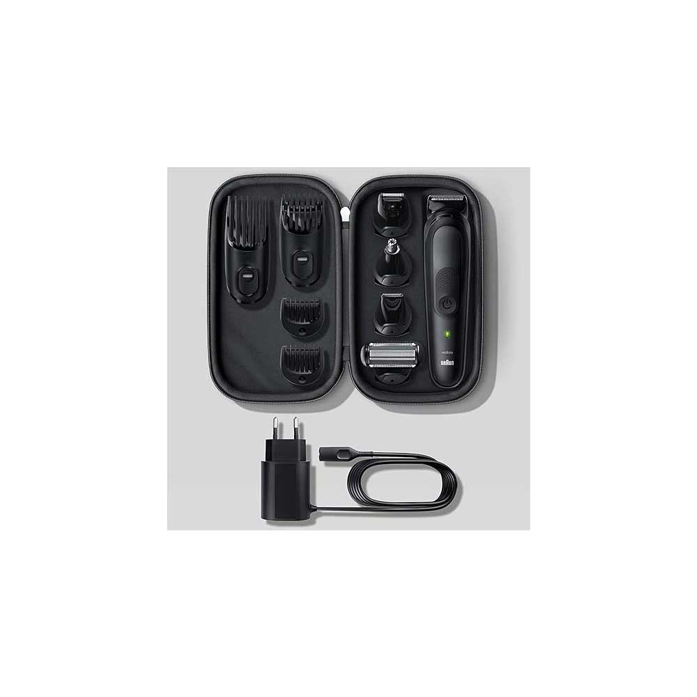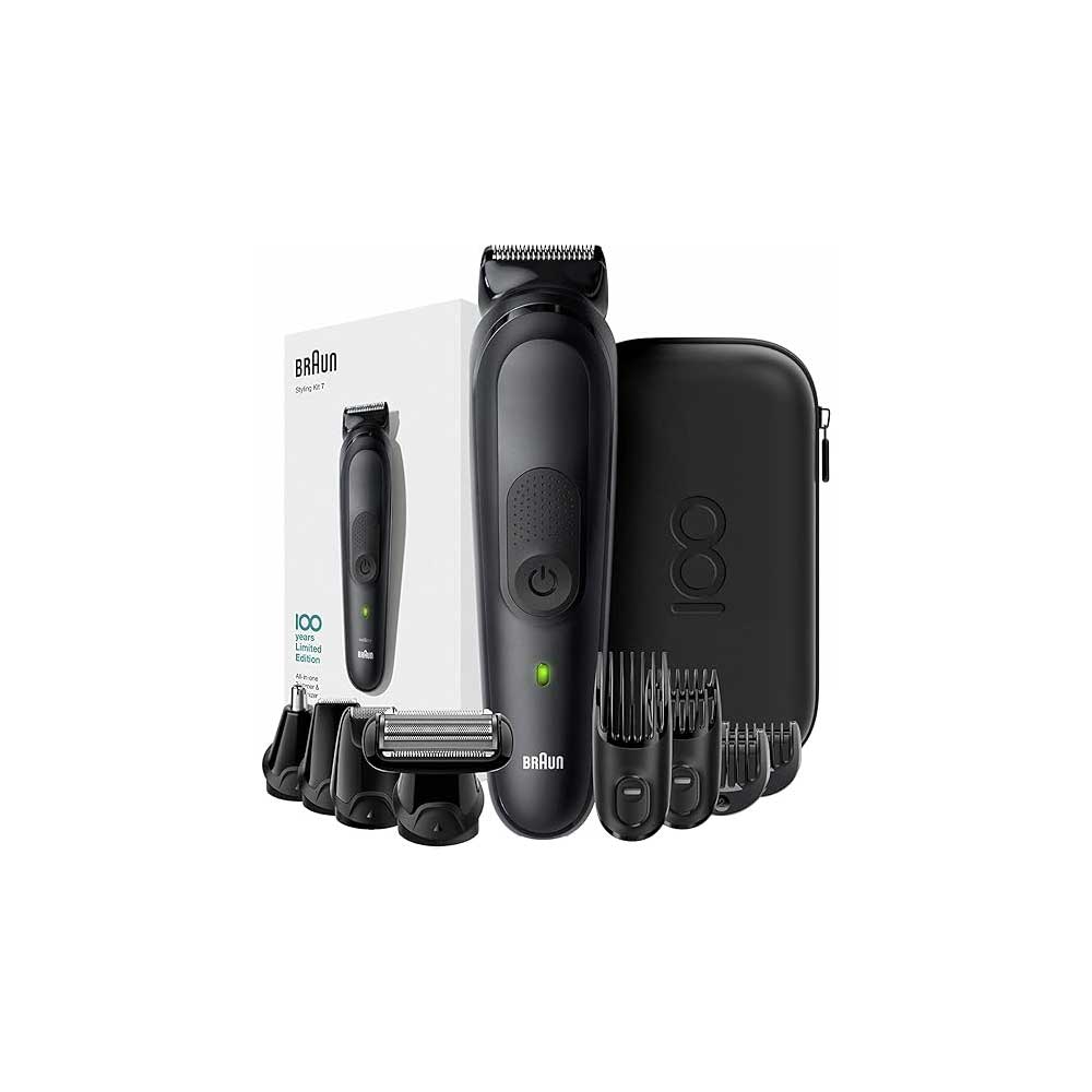 The Braun MultiGroomer MBMGK7 BLK BOX CEEMEA is a 9-in-1 trimmer for men, with all the attachments you need to trim your beard, hair, body, and nose. It comes with a black box for storage and travel.