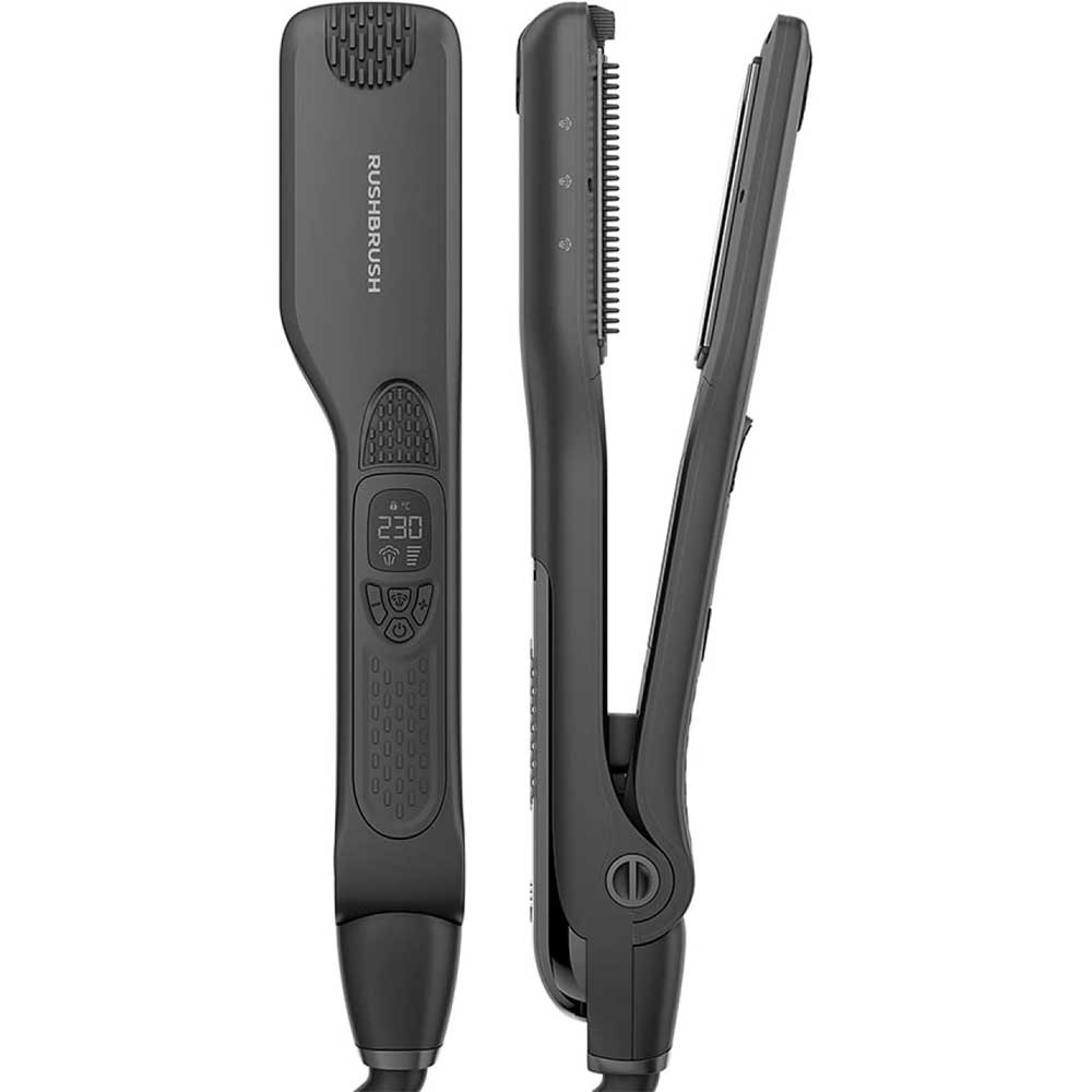 Rush Brush® Steamer PRO brings you premium hairstyling with exquisite results and no damage with its 4D floating plates without the need to tug or pull hard. With its ion-infused steam, the negative ions penetrate into your hair giving shiny, frizz-free, and sleek results. Also, with its detachable comb and Nano Titanium plates, you will enjoy steady temperature and faster hair styling. It also features a smart LCD screen to enjoy perfectly styled hair with minimal effort.