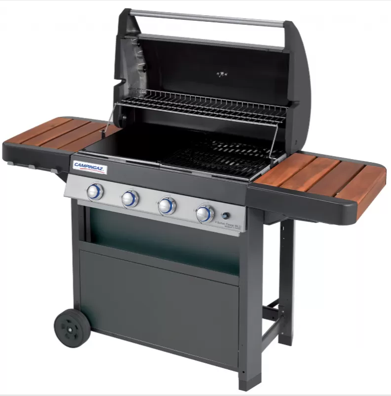 شواية غاز احترافية من Campingaz، بموديل 4 Series Classic LS Plus ومساحة طهي واسعة (≈ 3500 سم²)، تضم 4 شعلات من الفولاذ المقاوم للصدأ وتقنيات متقدمة مثل InstaClean® وEven Temp®.