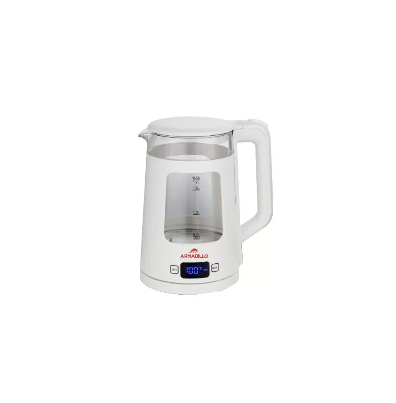 غلاية Armadillo الزجاجية الرقمية بسعة 1.7 لتر وبقوة 1850-2200 وات (موديل ARM-SDA-KTL-WH-0001) باللون الأبيض، تجمع بين التصميم العصري والتحكم الرقمي لتجربة غلي آمن وأنيق للمياه.