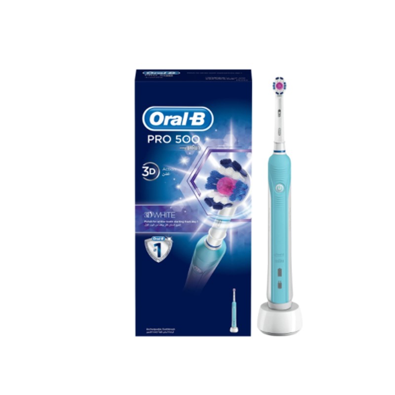 The Oral-B Pro 500 3D White is a rechargeable electric toothbrush that removes up to 100% more plaque than a regular manual toothbrush. It features advanced 3D cleaning technology that rotates, oscillates, and pulses to break up and remove plaque from between the teeth and along the gum line. It also features a specialized polishing cup that whitens teeth starting from day one by removing surface stains.