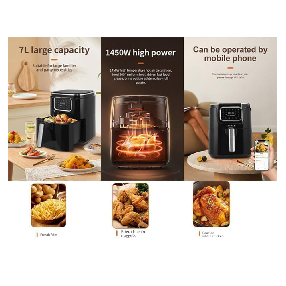 Digital Air Fryer with a 7-liter capacity, 1450 W power, featuring a digital display, smart digital control, Bluetooth technology for remote operation, and a sleek modern design.