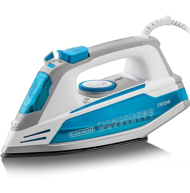 مكواة البخار BLACK+DECKER موديل X2800-B5 بقدرة 2800 وات وسعة خزان مياه 330 مل، بتصميم أنيق بالأبيض والأزرق الفاتح، تجمع بين الأداء العالي واللمسة الجمالية للمنزل.
