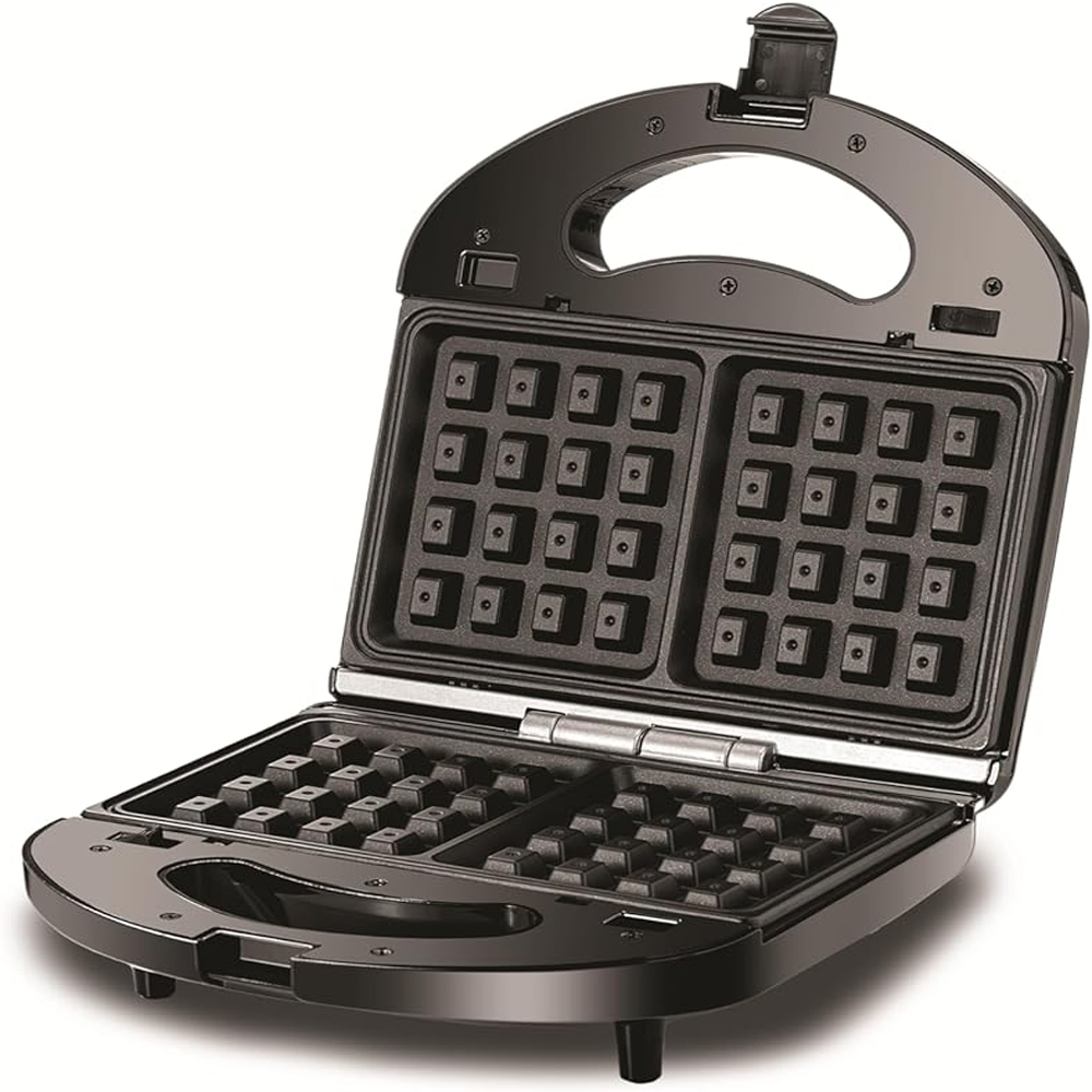 Multi-function kitchen appliance with 780W power, featuring interchangeable plates (grill, waffle, and sandwich) with a non-stick coating, allowing you to prepare toasted sandwiches, waffles, and grilled foods all with a single versatile unit.