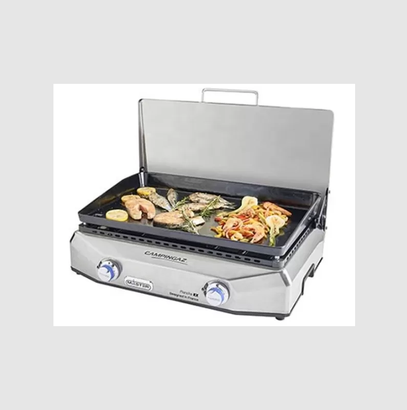 شواية بلانشا من Campingaz بمساحة طهي تبلغ 2400 سم² (≈ 60×40 سم)، مزوّدة بتقنية Blue Flame وسطح طهي من الحديد الزهر، مناسبة لطهي جماعي في الهواء الطلق.