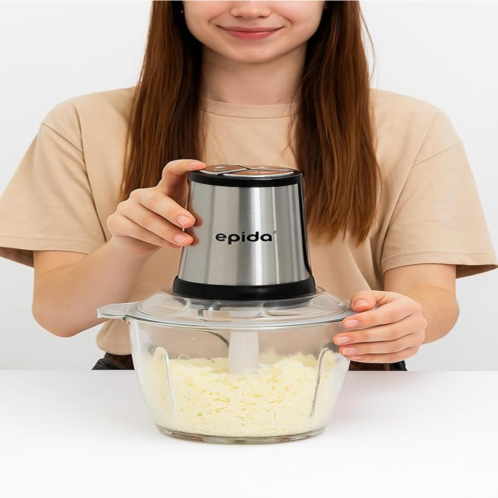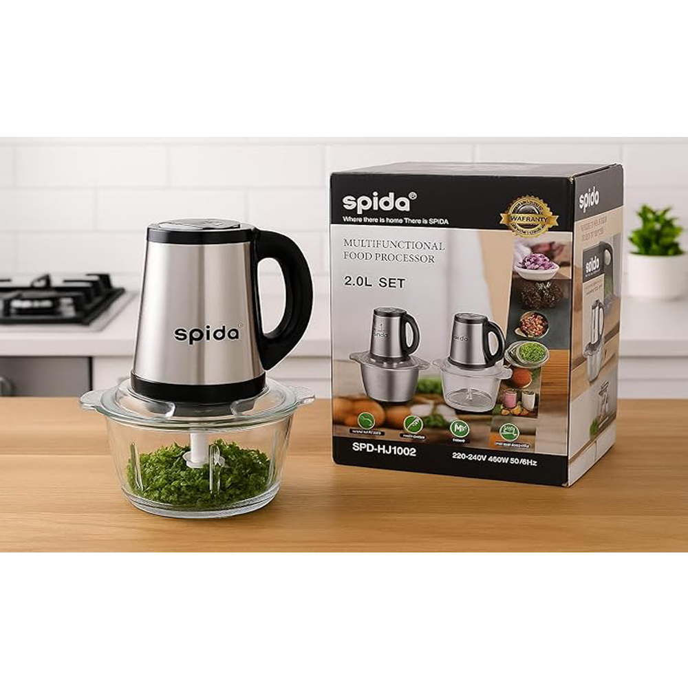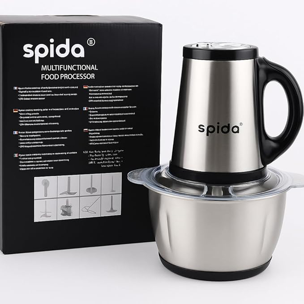 Spida Chopper – 3-Liter Capacity, 650W Powerful Motor Large dual bowl made of stainless steel and glass provides flexibility for handling both hot and cold ingredients. Ideal for families and daily heavy use. High-performance motor ensures precise chopping and grinding. Large bowl accommodates bigger quantities. Quad sharp blades deliver efficient performance with vegetables, meat, onions, and nuts. Modern design with non-slip base and secure lid. Easy to clean and one-touch operation for convenient and quick use. A complete solution combining capacity, power, and versatility for the modern kitchen.