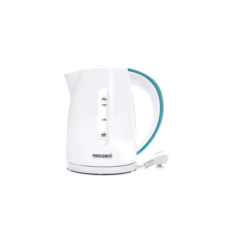 غلاية كهربائية من MediaTech طراز MT‑K199 بسعة 1.7 لتر وقدرة 2200 وات، مصنوعة من البلاستيك، بلون أبيض — خيار عملي لمنزل يومي.