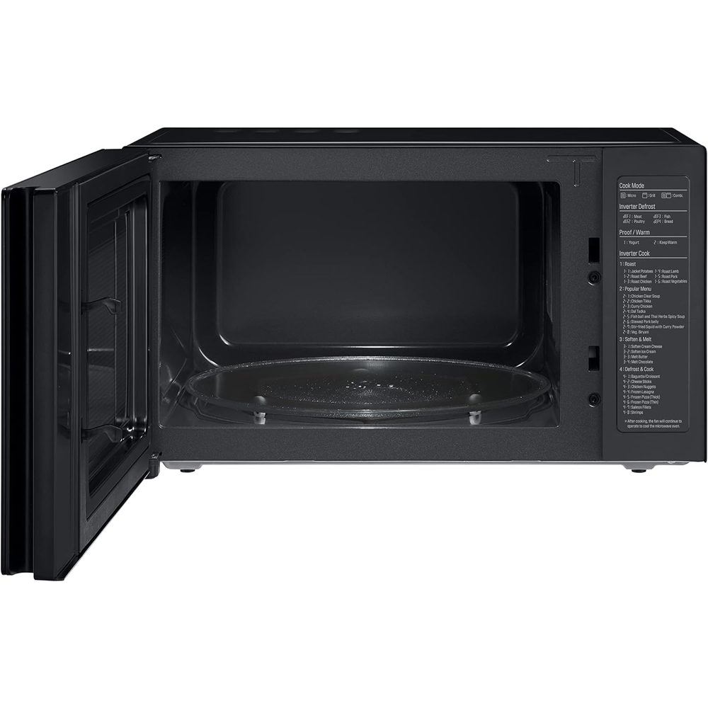 Capacity: 42 liters Power: Output: 1200 Microwave: 1350 W Grill: 1000 W Combi (Microwave + Grill): 1500 W Electrical power: 230 V / 50 Hz Heater type: Easy-clean quartz coating (antibacterial) Color: Black Control unit: White touch lamp with enamel door – side-swing opening, time setting, child safety lock, quick start, taste tasting, cooking functions / defrost function Toasting: 5 levels Soften/defrost: 2 levels Resistance and heating: 4 levels Inverter defrost: 8 levels Cooking/defrost functions: 8 Net weight: 13 kg Dimensions (W × H × D) in mm: Interior: 544 × 307 × 458 Exterior: 544 × 307 × 458