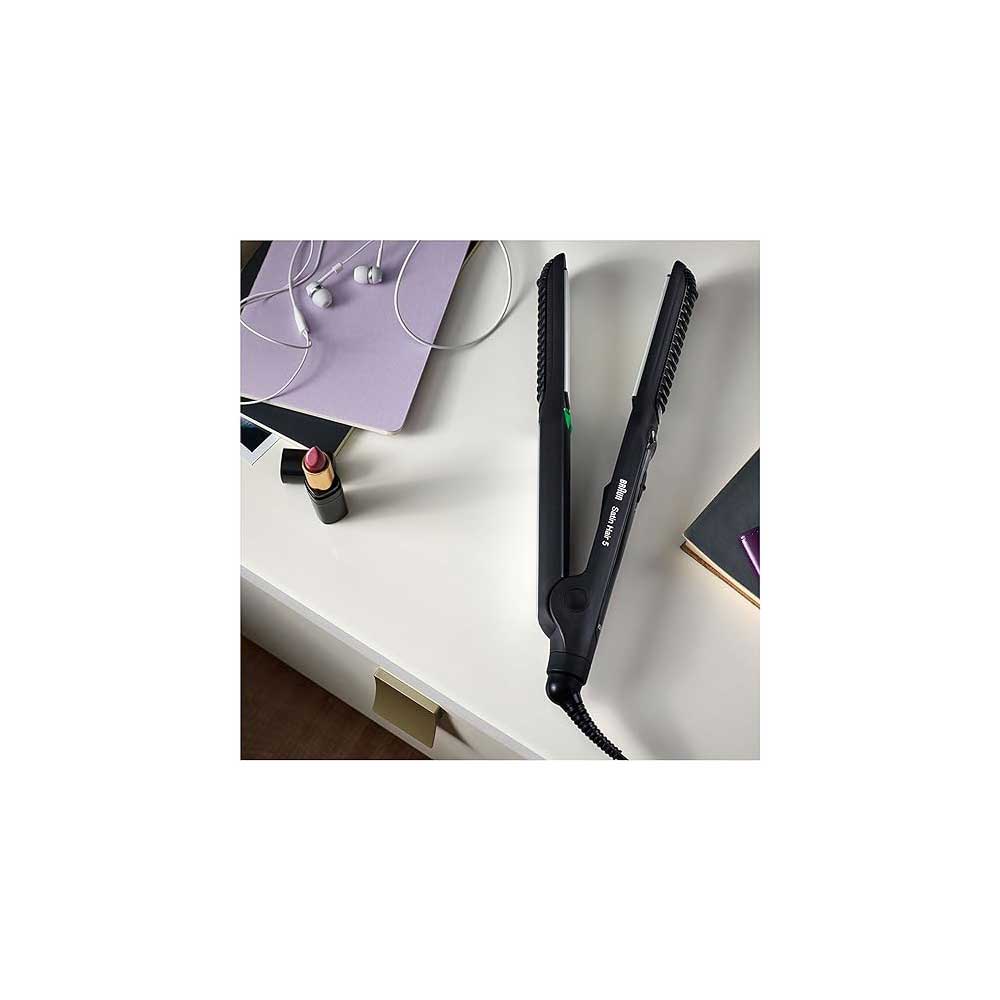 The Braun St550 Satin Hair 5 Styler Ceramic Flat Iron Hair Straightener is a high-quality hair straightener that uses ceramic plates to evenly distribute heat and prevent damage to your hair. It has a variety of heat settings to choose from, so you can find the perfect one for your hair type. It also has a cool shot button that helps to set your style in place.